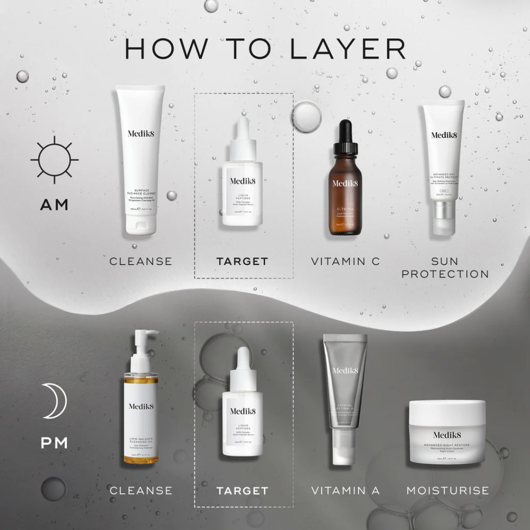 Medik8 Liquid Peptides is a high-performance age-defying serum formulated with a powerful 30% peptide complex to visibly smooth fine lines, expression lines, and deeper wrinkles. This lightweight, hydrating serum works to improve skin firmness, elasticity, and overall texture while delivering deep hydration. Designed to target visible signs of ageing at multiple levels, the fast-absorbing formula helps plump and refine the skin, leaving the complexion smoother, more youthful, and revitalised.